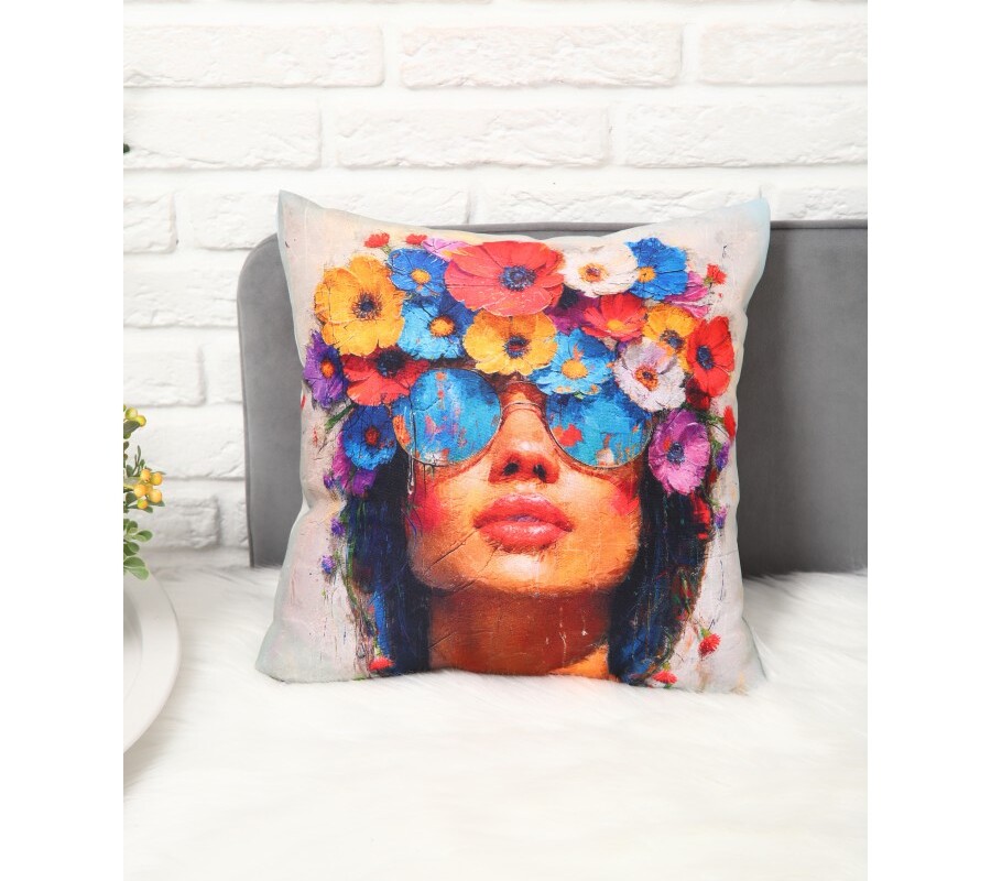 Декоративная интерьерная наволочка из габардина "Девушка с цветами" на потайной молнии. Размер 35х35 см.
