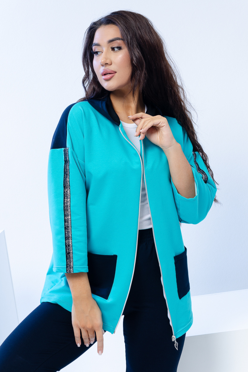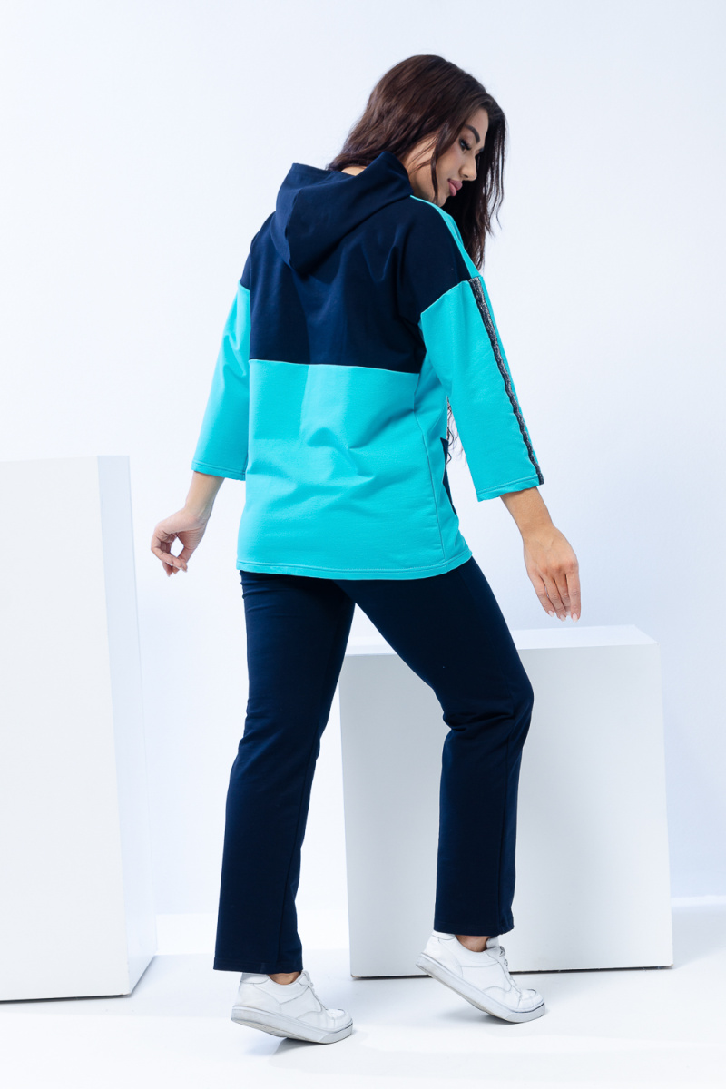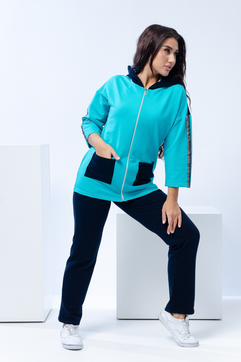 Костюм женский с брюками выполнен из ткани футер 2-нитка качества пенье. Кофта с капюшоном, на серебристой молнии, с двумя накладными карманами, спущенный рукав 3/4. На рукавах пришита декоративная тесьма с люрексом. Брюки на поясе с карманами. Костюм идеально подойдет для прогулок, спорта и отдыха.