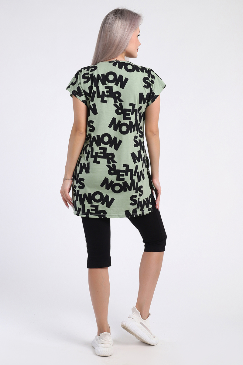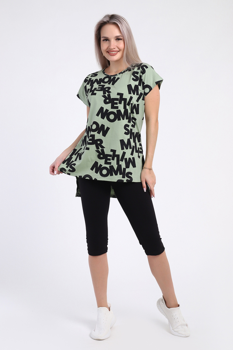 Женский костюм из футболки и бриджей — отличный выбор для дачного сезона и прогулок. Футболка в бежевом или оливковом цвете с набивным принтом в виде крупных букв придаёт образу современный и стильный вид. Бриджи черного цвета из 100% хлопка обеспечивают комфорт и свободу движения, что особенно важно для активного отдыха на свежем воздухе или дома.